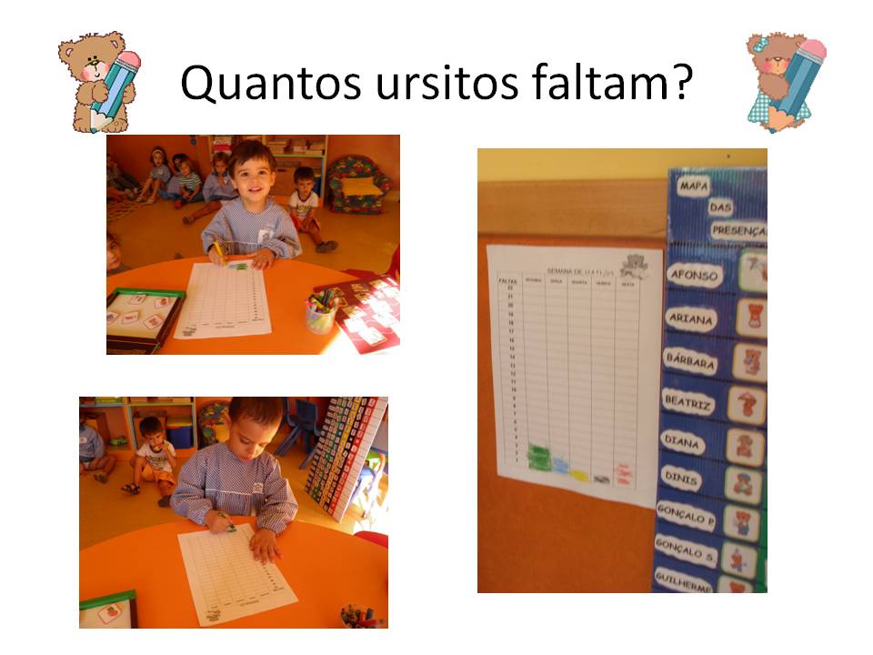 Semanalmente, observanmos o mapa de presenças e contamos quantos colegas faltaram, depois é só registar no nosso mapa.Criamos assim, uma tabela que nos ajuda a desenlvolver e a trabalhar a matemática.