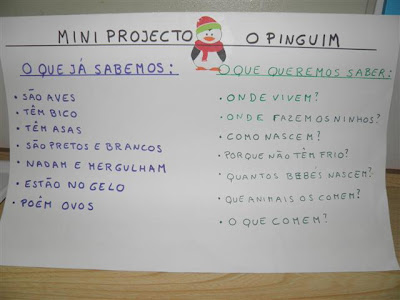 Ao conversarmos sobre o Inverno, observámos algumas imagens e daí surgiu a ideia de fazermos um projecto sobre os pinguins. Anotámos o que já sabíamos e o que queremos saber e combinámos levar trabalho para casa, pesquisar materiais sobre o tema: livros, jogos, bonecos, desenhos, textos, etc.
